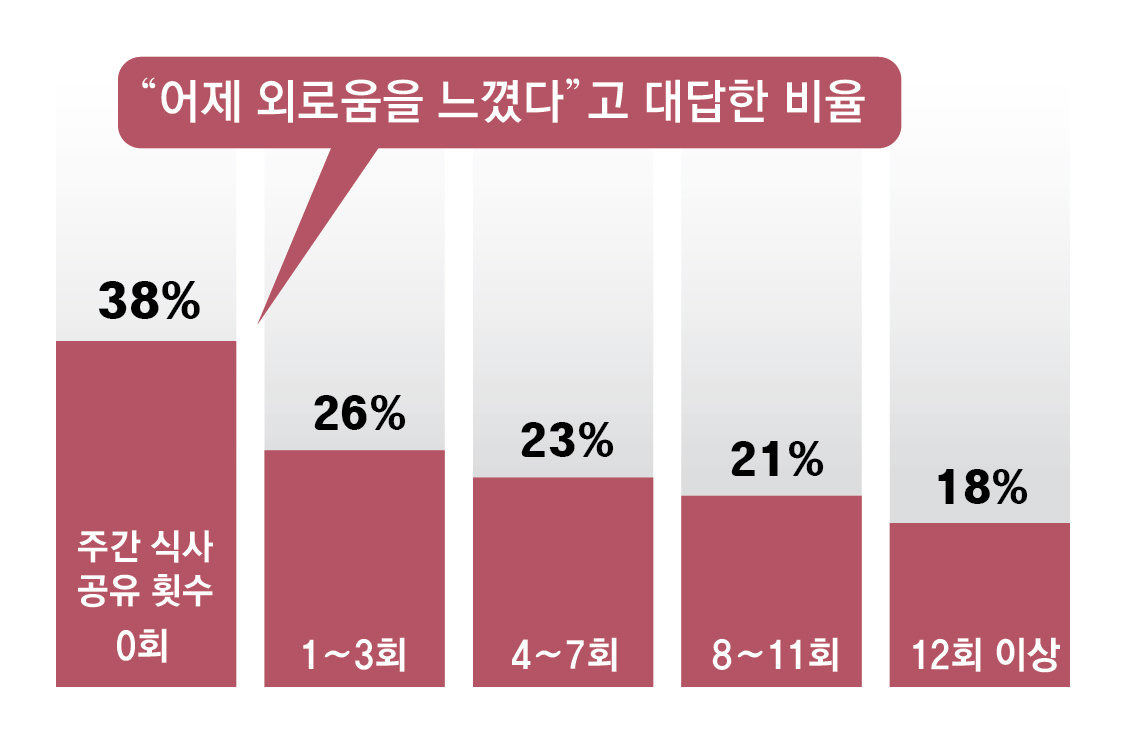 문제는 혼밥이 인간의 외로운 감정을 고조시킨다는 점이다. 주 12회 이상 식사를 공유한다고 밝힌 사람들의 18%만이 “어제 외로움을 느꼈다”고 답했다. 반면 1주일 내내 혼밥을 한다고 답한 그룹에서는 38%가 “외로움을 느꼈다”고 했다.