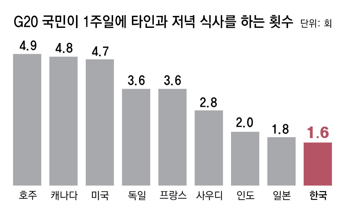 한국인은 점심을 합해도 타인과 함께 식사하는 경우가 1주일에 평균 4.3회에 그쳤다. 중남미 국가들이 평균 8.8회, 북미·호주·뉴질랜드와 서유럽이 각각 8.3회인 것과 대조된다.
