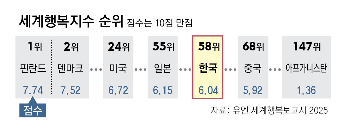 유엔 세계행복보고서는 옥스퍼드대 웰빙연구센터, 여론조사회사 갤럽, 유엔 지속가능발전해법네트워크(SDSN)가 협업해 매년 발간한다. 올해 세계 행복 순위는 핀란드(10점 만점에 7.736점)와 덴마크, 아이슬란드, 스웨덴 등 북유럽 국가들이 1~4위를 차지했다. 아프가니스탄은 1.364점으로 ‘가장 불행한 국가’에 올랐다.내생각